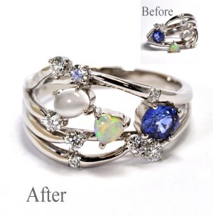 | お客様お手持ちのデザインリングに留めて あったハートのオパールが取れてしまった ので、修理とサイズ直しのご注文をいただき ました。 割れやすい石ですので、レーザーで オパールを留めました。 サイズも直り、出来上がった指輪を見て お客様に喜んでいただきました。 サイズ直しとオパール留めの詳細はこちら |